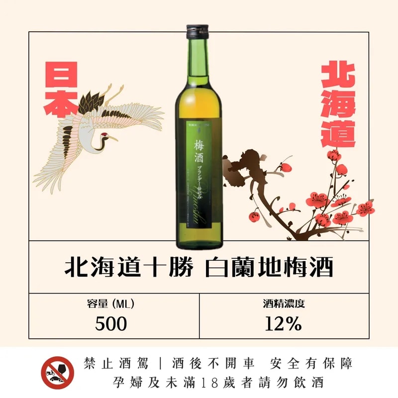 將北海道當季青梅與自家白蘭地原酒置於法國橡木桶熟成。 白蘭地的濃醇香氣與梅子的淡雅酸香交織,甜度較低但後味豐富溫潤,呈現深層果香與橡木成熟芬芳的成熟風味。 富有白蘭地的特性,可享受冰~熱飲,不同溫度下梅酒風味的變化