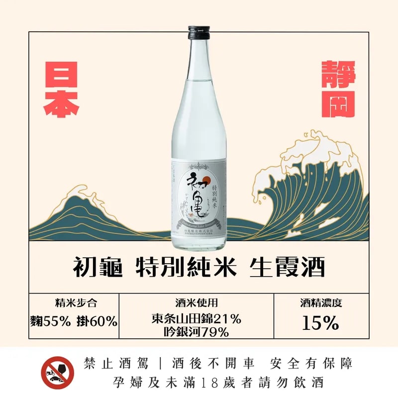 往年掛米皆採用靜岡縣產的令和譽富士,但今年因優質米量難以充足採購,改以東条山田錦搭配岩手縣產的吟銀河。此銘柄為初龜經典的特別純米酒,以季節限定的生霞酒方式華麗登場。 令人心曠神怡的香蕉般甜美香氣,清澈而優雅。入口薄醪由來的柔和、舒適口感,隨後是飽滿、溫和的旨味優美地擴散。優雅的酸度點綴得恰到好處,尾韻是一抹溫柔的甘甜輕盈繚繞,隨後俐落地入喉。 這是一款溫柔清爽的酒,可以搭配新鮮刺身、涼拌白身魚或季節時蔬,讓料理的鮮甜在酒體的襯托下,層次感倍增。 原料:米、米麴