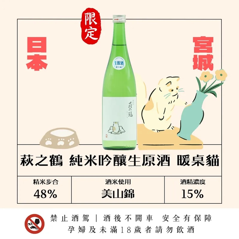 🏆2013 日本酒競賽 大吟釀部門 榮獲最高金賞 萩之鶴暖桌貓純米吟釀生原酒,是專為冬季設計的療癒之作。 酒體帶有蘋果與哈密瓜的飽滿香氣,口感圓潤且伴隨著恰到好處的微甜旨味,彷彿冬日裡躲進暖桌般的舒適與放鬆。 這款生原酒特別推薦從冰飲開始,隨著室溫緩慢回溫至常溫飲用。在溫度升高的過程中,暖桌貓會展現出不同的層次與風味變化。搭配萩之鶴標誌性的宜人酸度調和,整體口感輕盈不膩口,是款不論單飲或佐餐都能輕鬆享受的季節限定佳釀。 日本酒度:-5(甘口類型) 原料:米、米麴