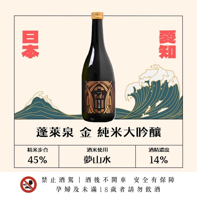 🏆2022 世界競賽IWC 銅賞 蓬萊泉推出全新荒川杜氏系列。 選用奧三河產夢山水酒米,精米步合百分之四十五。十四度的低酒精設計,使其如葡萄酒般輕快易飲。 帶有西洋梨般優雅寬廣的香氣,口感輕盈細緻。適合搭配鮪魚、鰹魚等鮮味濃郁的料理。 瓶標採用金黃稻穗設計,是份精緻且體面的送禮首選。 原料:米、米麴
